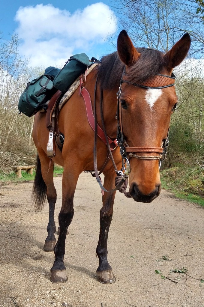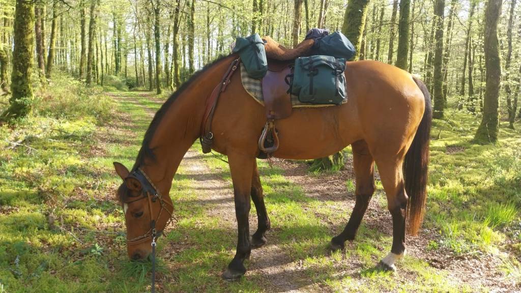 Au total, tous équipements compris, on est a un peu plus de 30kg, dont 18kg de sacoches, et environ 12kg de harnachements. En y ajoutant mon poids, on arrive autour de 90kg de chargement total, pour la jument qui doit faire aux alentours de 500kg. 18%, on n’est pas si mal pour des presque novices !