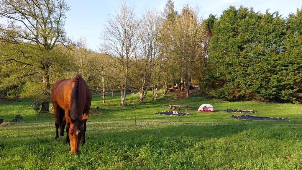 Une bière partagée et une bonne douche chaude plus tard, je me glisse dans mon duvet et m’endors avec le concert des oiseaux alentours, et les bruits de mâchonnements réguliers de la jument qui me rassurent sur sa sérénité nocturne. Le lendemain, retour aux écuries au pas de course… de nous deux, elle est loin d’être la plus fatiguée !