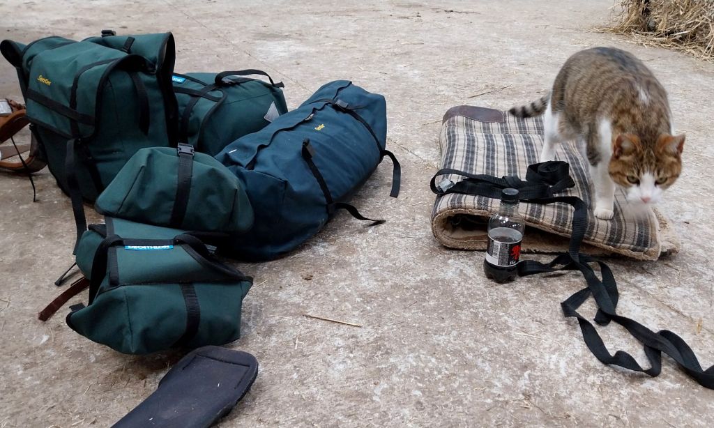 Derniers préparatifs avant de prendre la route, Quanan grignote sa ration de foin pendant que je réparti mes extras de nourriture comme je peux dans mes sacoches.