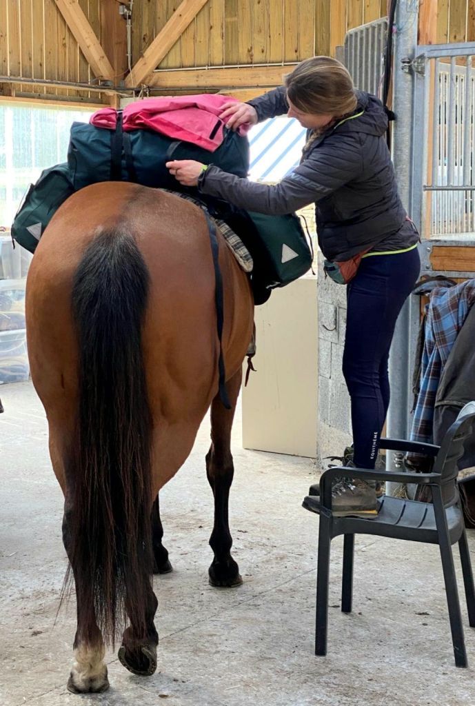Une fois nos valises prêtes, elle somnole à l’attache dans l’écurie pendant que je la selle. Il me faut une bonne vingtaine de minutes pour la préparer et ajuster méticuleusement ses sacoches, en optimisant la répartition de leur poids pour éviter les déséquilibres et limiter les frottements.