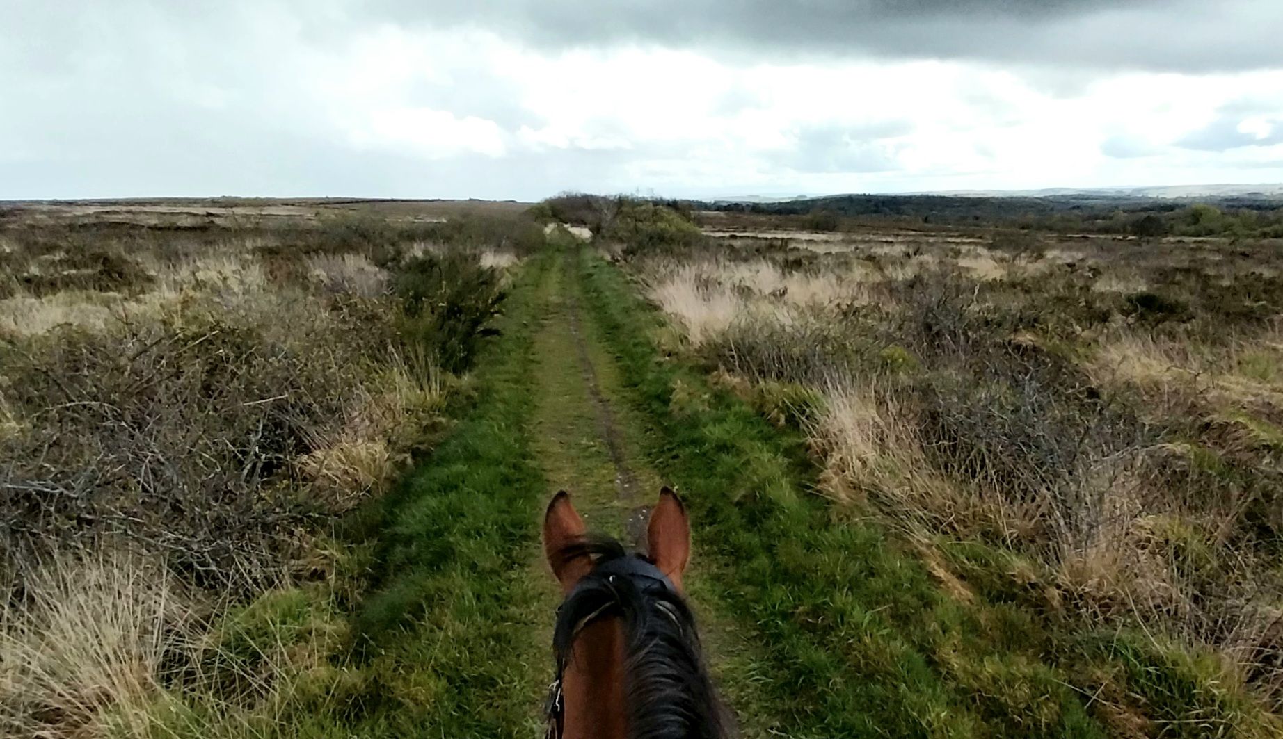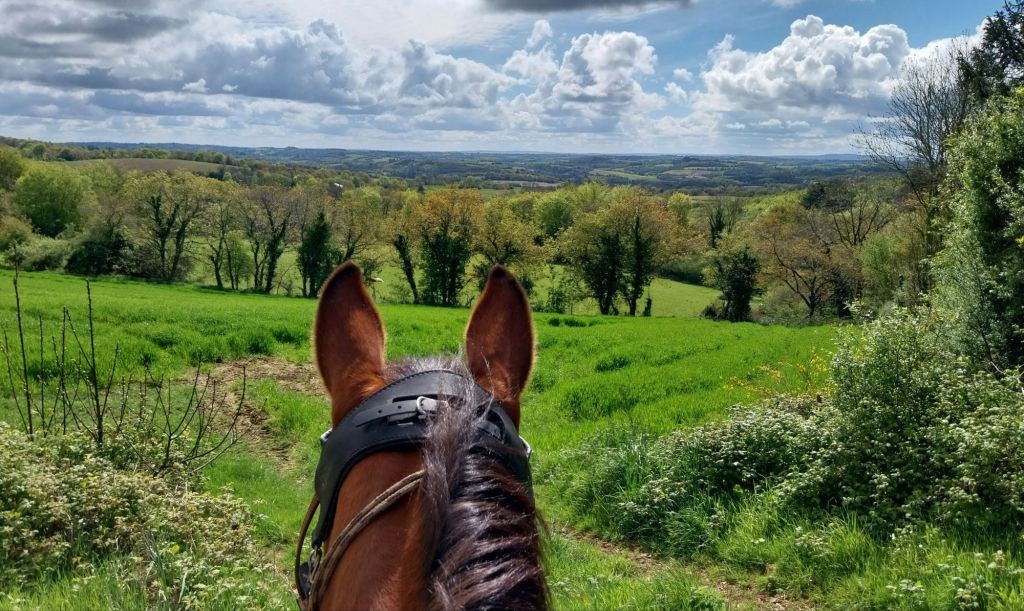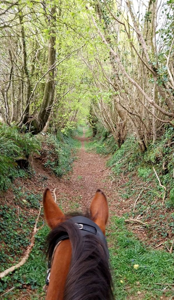 Le lendemain, cette journée de pause nous a fait le plus grand bien. Tout est prêt pour reprendre la route, Quanan à retrouvé sa grande forme et marche en sautillant, à la limite du trot. On grimpe direction les Monts d’Arrée, et les panoramas vallonnés sont magnifiques. Le soleil est enfin de la partie durant un bon morceau de la journée. Il nous réchauffe la peau et la jument à l’air de l’apprécier autant que moi.