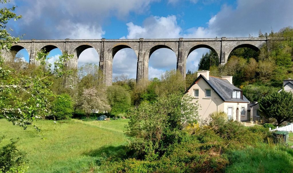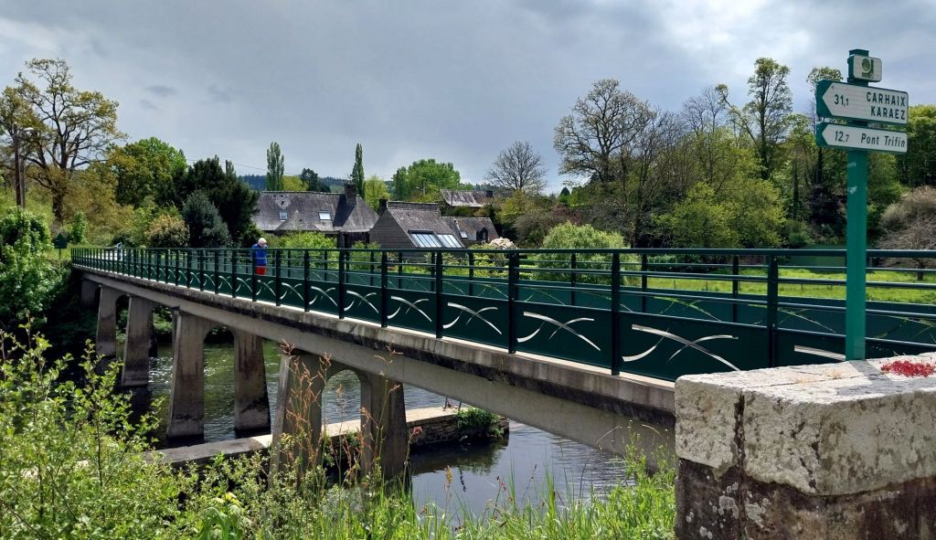 Nous célébrons notre première semaine sur la route avec notre plus grosse étape, avalant 32 kms. Les premières heures sont un peu ennuyeuses, et nous causent quelques détours du fait de chemins bouchés par des troncs. Encore un passage à gué à pied, qui me laisse les orteils glacés pour une partie de la journée, puis nous rejoignons la jolie voie verte qui relie Morlaix à Carhaix.