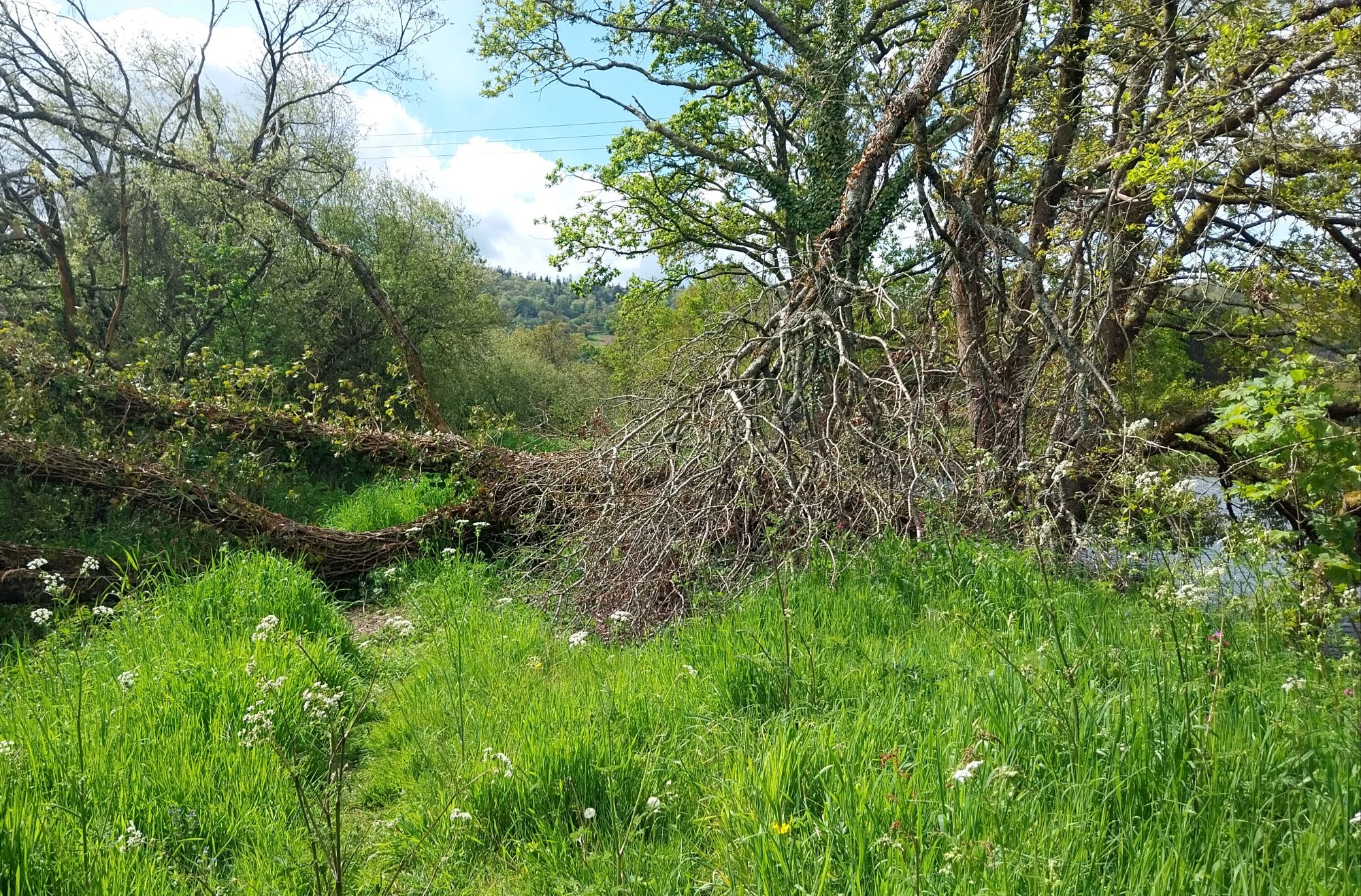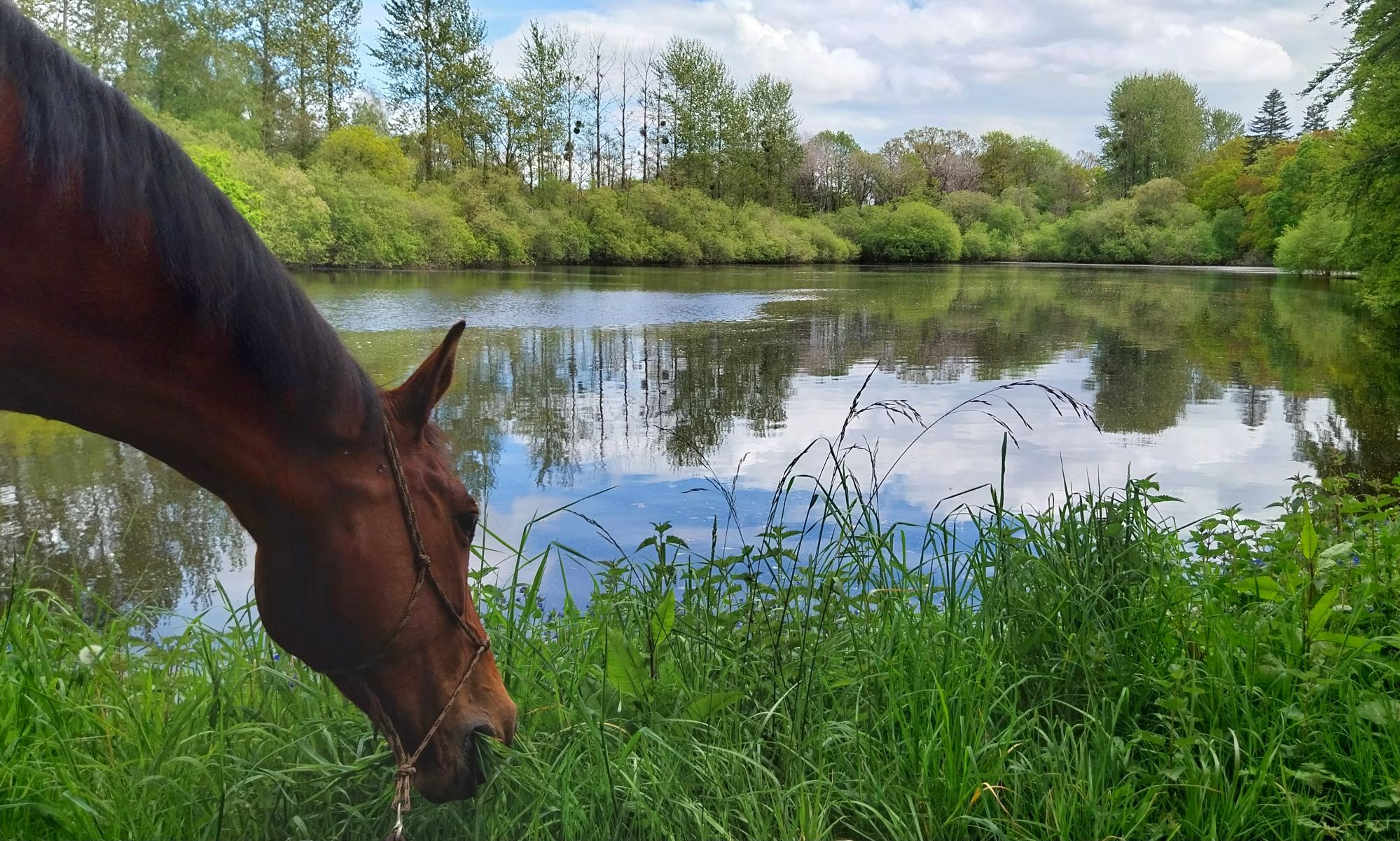 En pratique, après un charmant démarrage bucolique sur le sentier en herbe au sud du canal, on commence à devoir passer quelques branches au sol, puis en contourner d’autres avec d’étroits passages en bord de berge dans lesquels il ne vaut mieux pas trop zipper sous peine de finir à l’eau, puis devoir sauter un premier petit tronc, puis un deuxième (d’où l’utilité d’avoir une jument de saut d’obstacles…), pour finir par être complètement bloquées par un énorme arbre en plein travers du chemin.