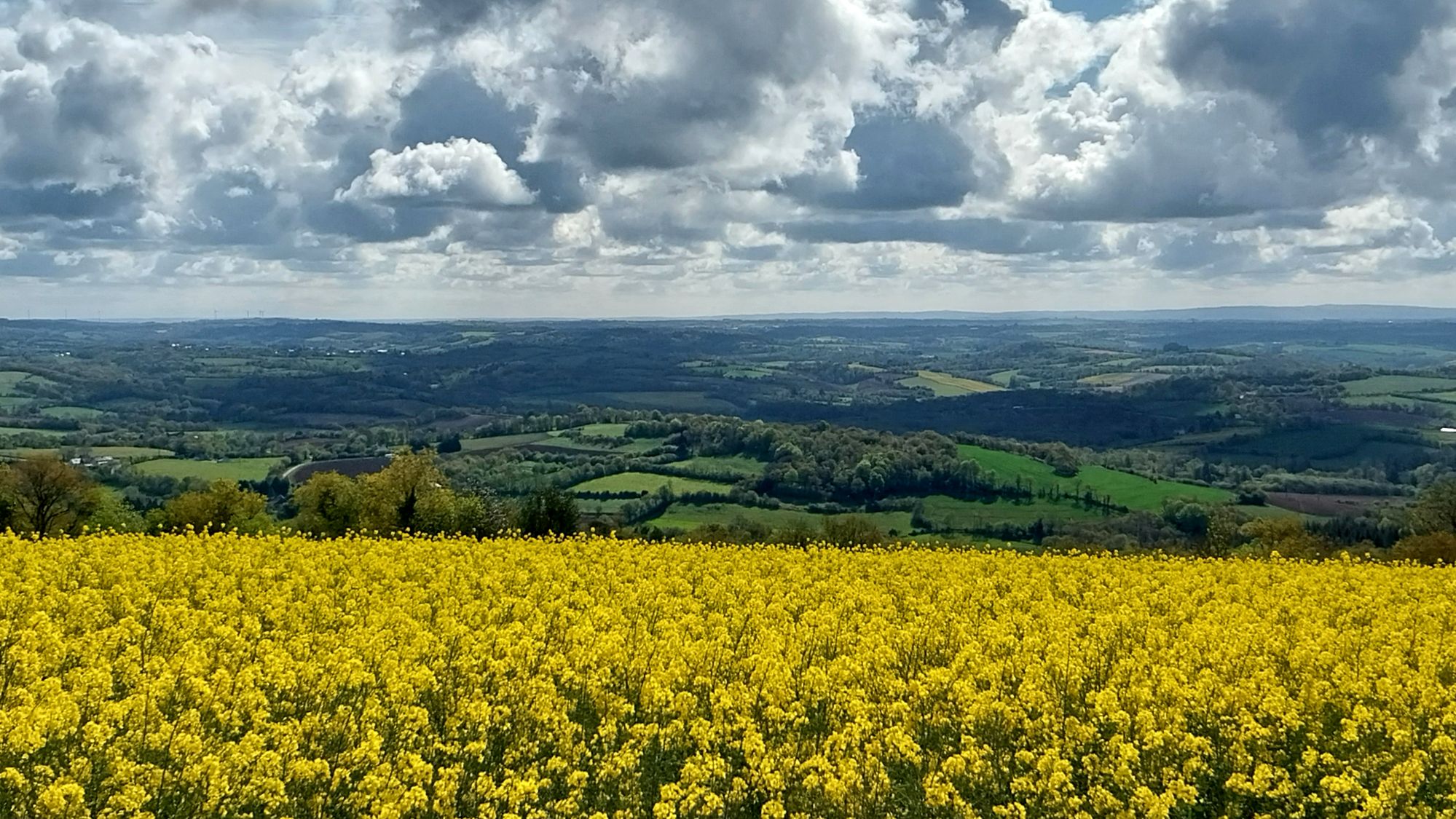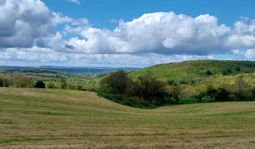 Les paysages sont vallonnés, les couleurs sont belles et contrastées, avec de gros nuages cotonneux qui dansent au dessus des champs. J’ai la chance d’être dans une partie ensoleillée, qui surplombe une petite vallée au fond de laquelle un large rideau gris trahit la pluie.
