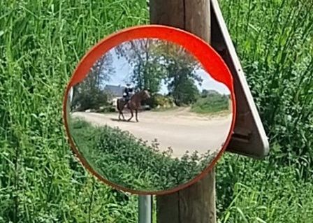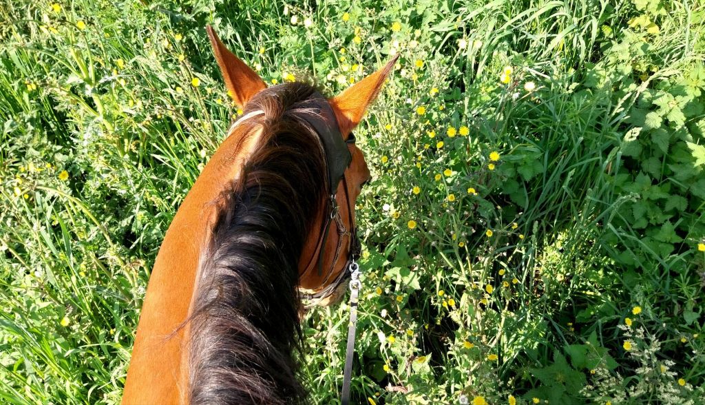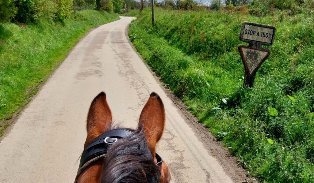 La jument commence à prendre ses habitudes et marche plus facilement sur les bas côtés pour économiser ses pieds, mais surtout pouvoir accéder à l’herbe aisément…