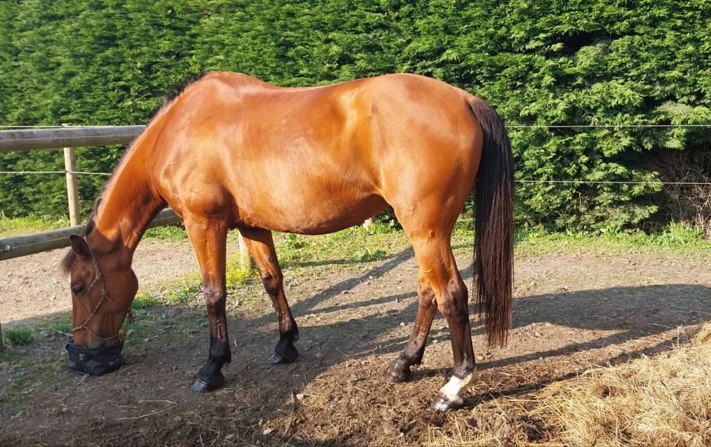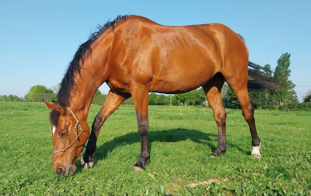 Sonia, qui habite à proximité et gère quelques chevaux en pension, nous a mis à disposition ce petit morceau de verdure, que nous partageons avec une autre jument et un poney.