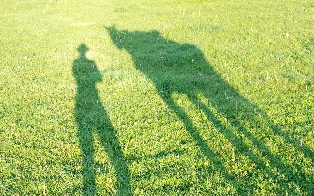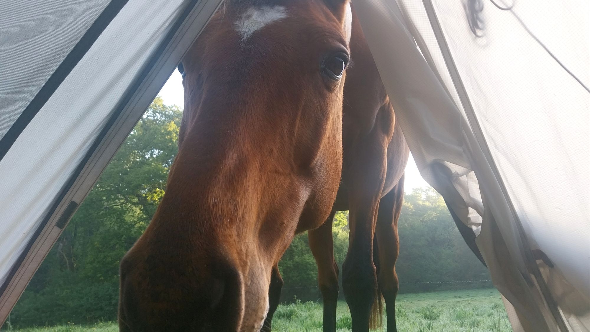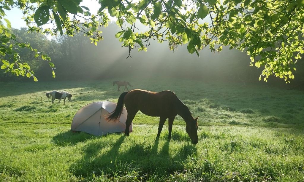 Aujourd’hui c’est une petite étape de 13kms qui nous attend, alors rien ne nous presse à partir tôt. J’ai pris soin de poser la tente plein Est pour pouvoir profiter des premiers rayons du matin, qui nous réchauffent progressivement. Toute la prairie s’illumine petit à petit, la jument vient tourner autour de moi, son ombre se découpant sur ma toile de tente avant de voir apparaître son gros museau à l’entrée de mon auvent.