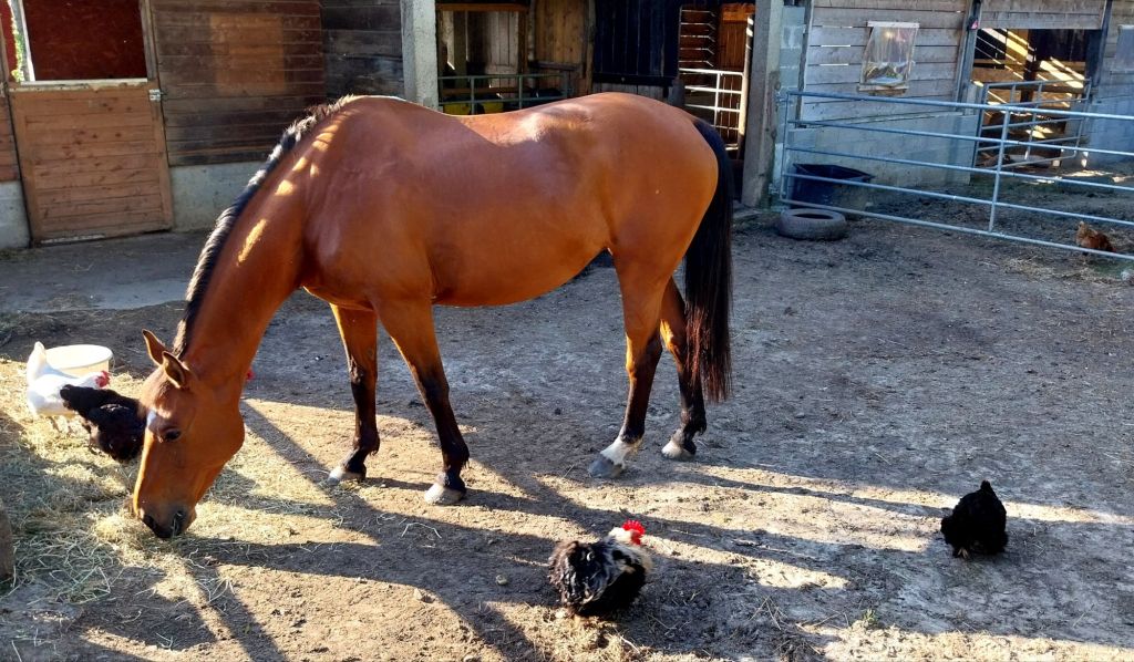 Pour ce soir, c’est avec des poules que la jument partage son espace. Elles picorent les restes des céréales tombées sur la terre battue, pendant que Quanan termine méticuleusement de lécher le fond de son seau, impassible à la petite troupe qui lui tourne autour.