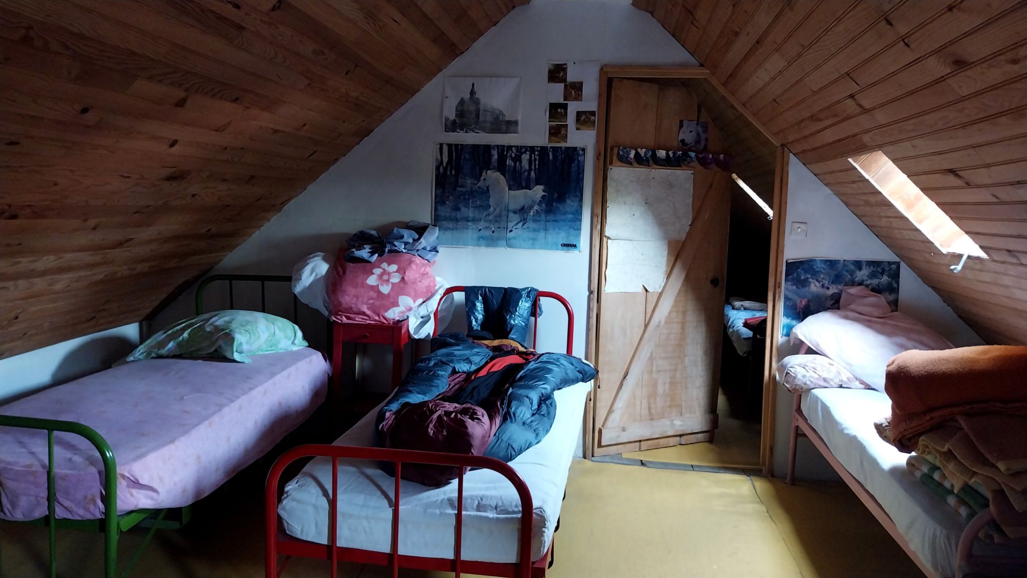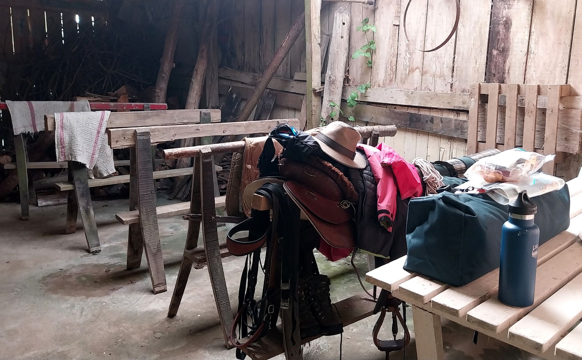 Le bâtiment dédié à ses occupants de passage a été pensé dans une grande fonctionnalité : de longues barres d’attache en bois pour les chevaux, des tréteaux alignés pour y poser son matériel, des tables et bancs, un dortoir à l’étage… Le temps semble s’être suspendu dans ce lieu dont les murs sont recouverts d’articles de journaux, de photos de randonnées et de cartes topographiques détaillées.