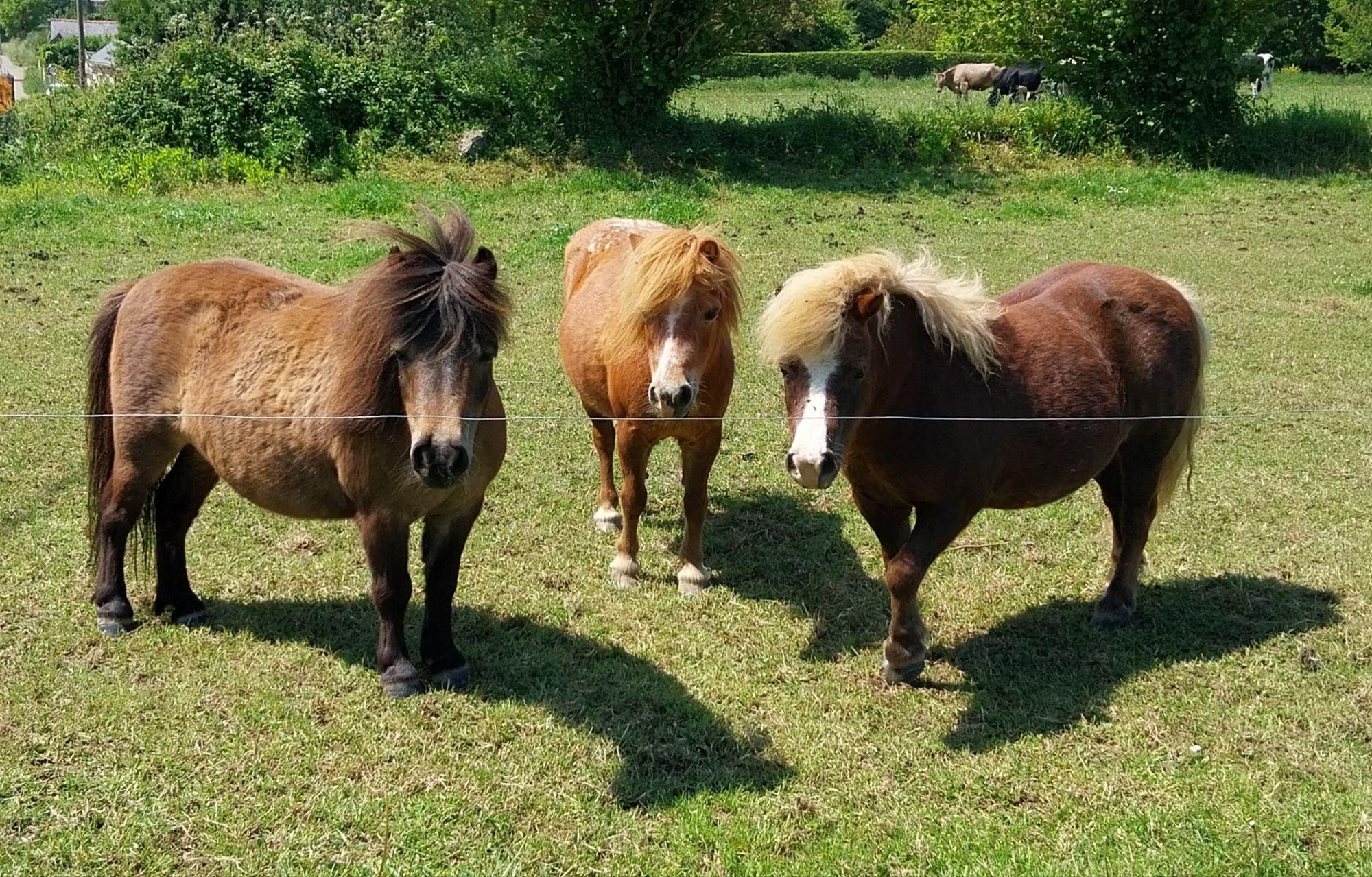 Le lendemain, Quanan et moi avançons jusqu’à Plourhan, dernière étape avant de rejoindre Saint Brieuc. Un petit arrêt boulangerie dans le village pour acheter ma « french baguette » en missionnant une dame qui la récupère gentiment pour moi pendant que je tiens la jument, et nous arrivons en début d’après midi au domaine de Beauregard, ensemble de gîtes dans un ancien corps de ferme, en face desquels Thomas, éleveur bovin, me met gentiment à disposition un grand pré en herbe, à côté de trois adorables poneys.