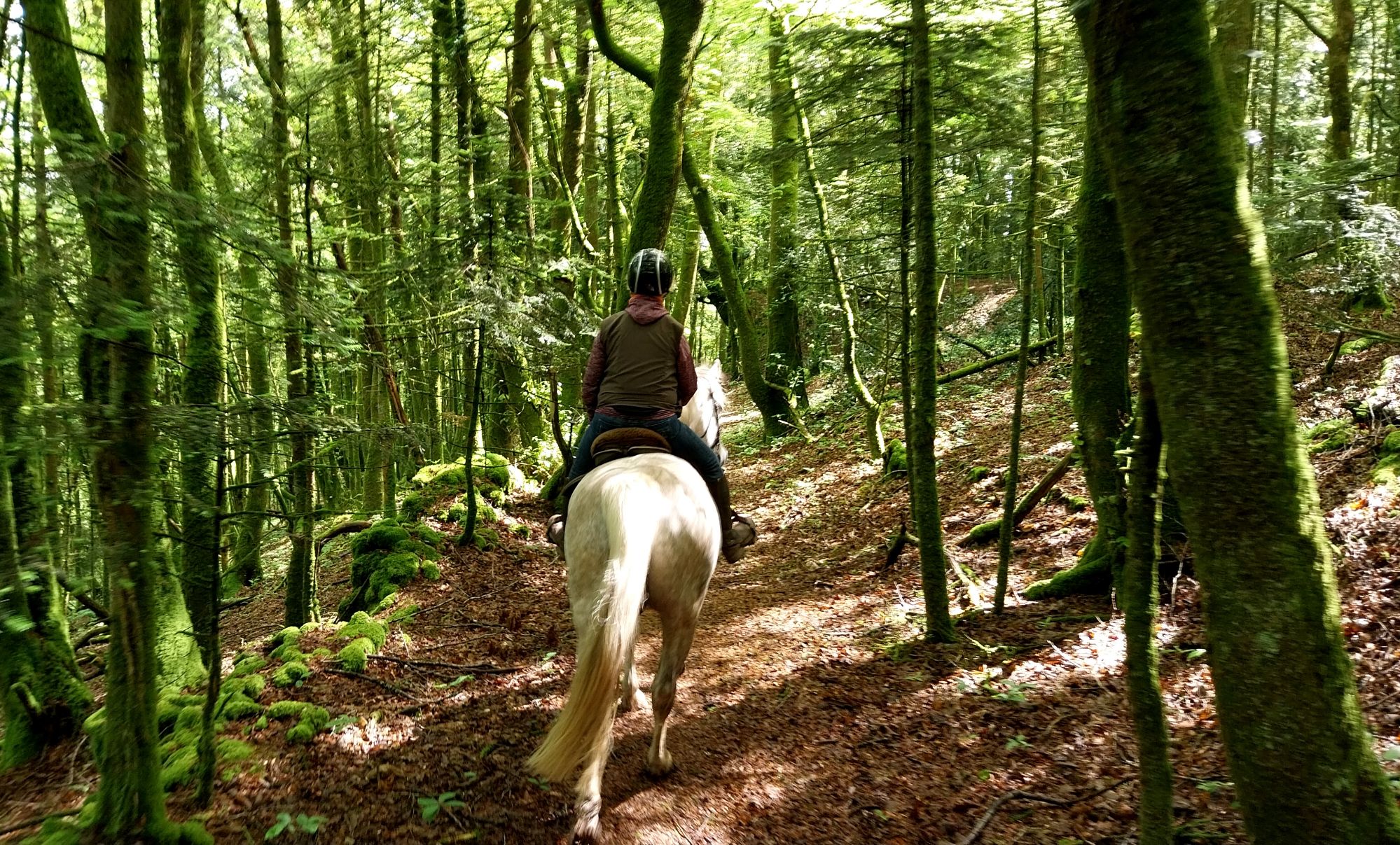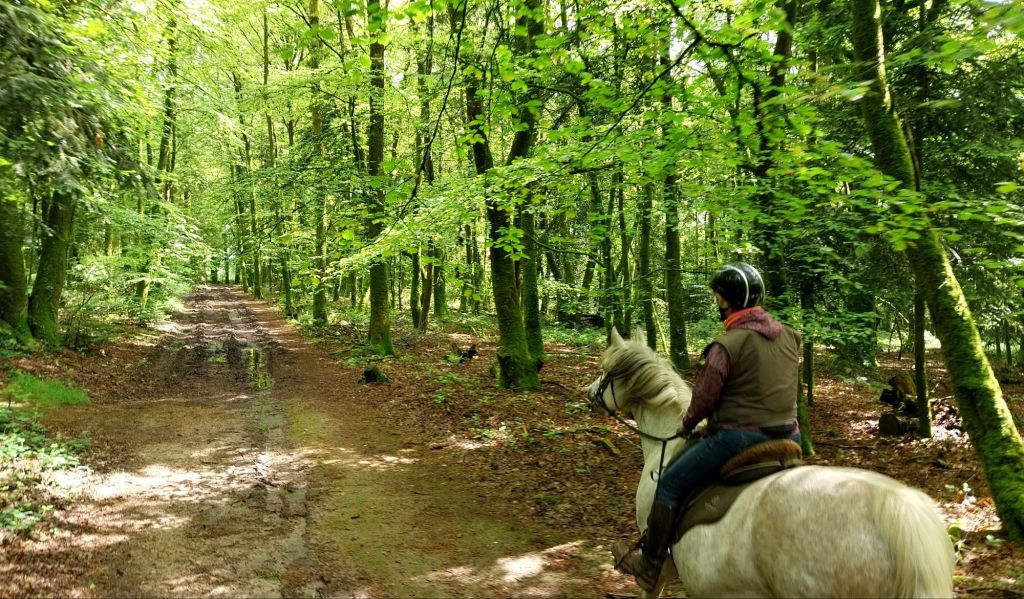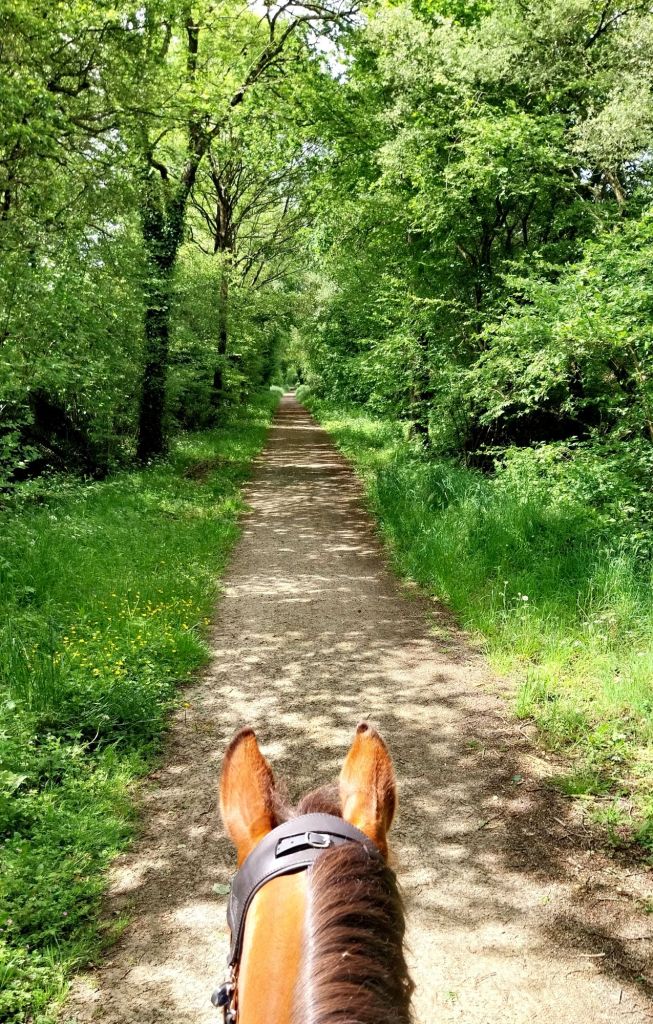 Pour cette journée de pause de vendredi, un créneau matinal ensoleillé nous permet une jolie petite sortie à cheval. Quanan et moi découvrons les sentiers moelleux de la forêt qui entourent la maison, accompagnées par Marie qui a pris un de ses chevaux et nous conte l’histoire des lieux aux abords desquels nous passons.