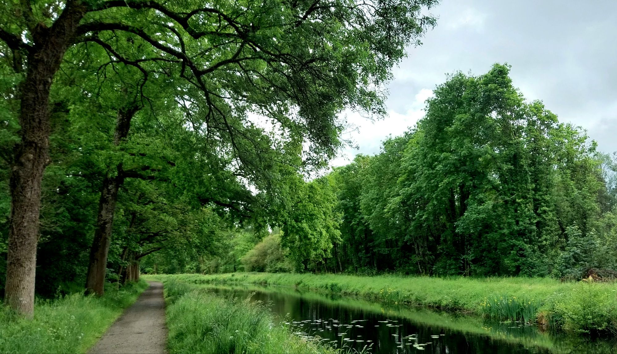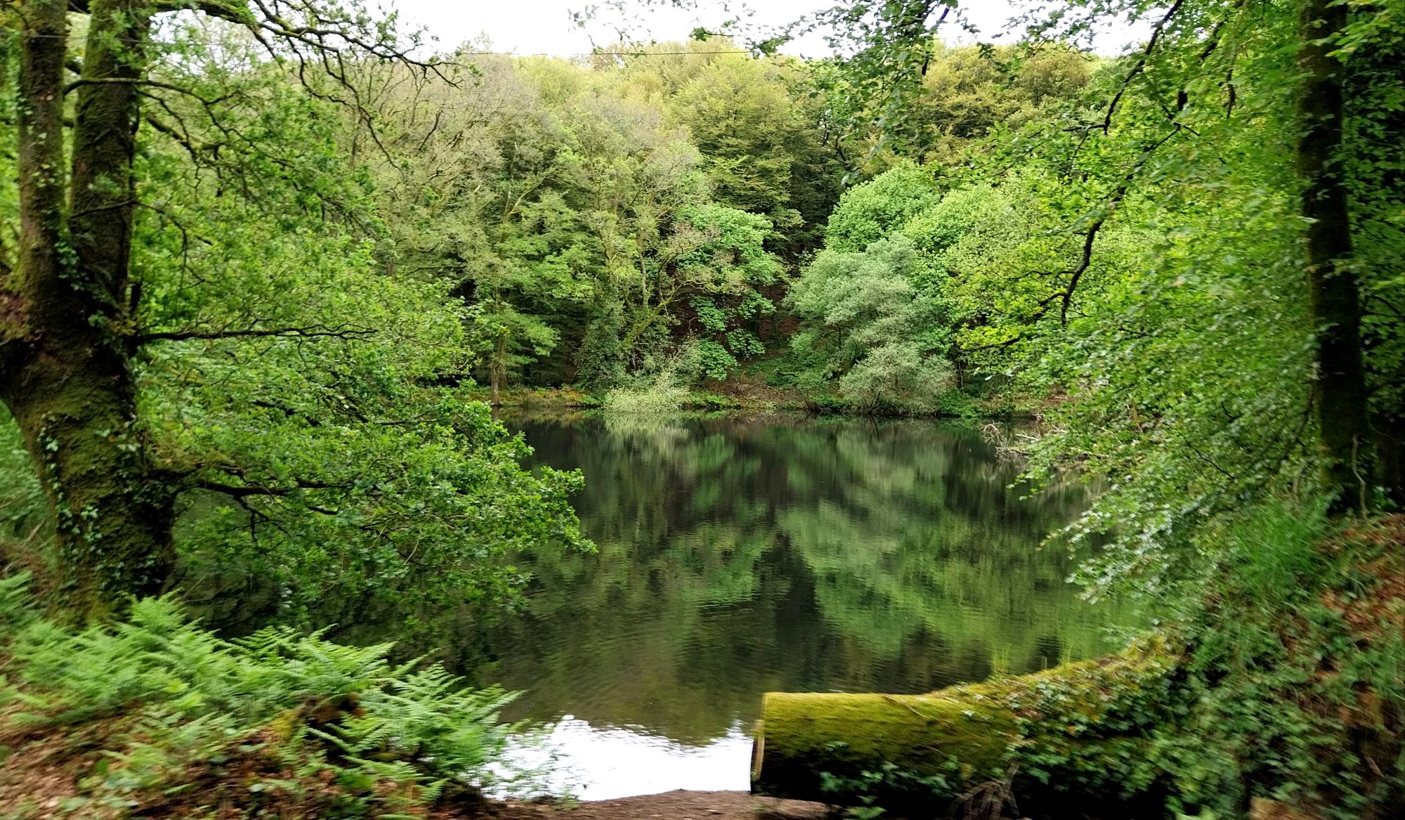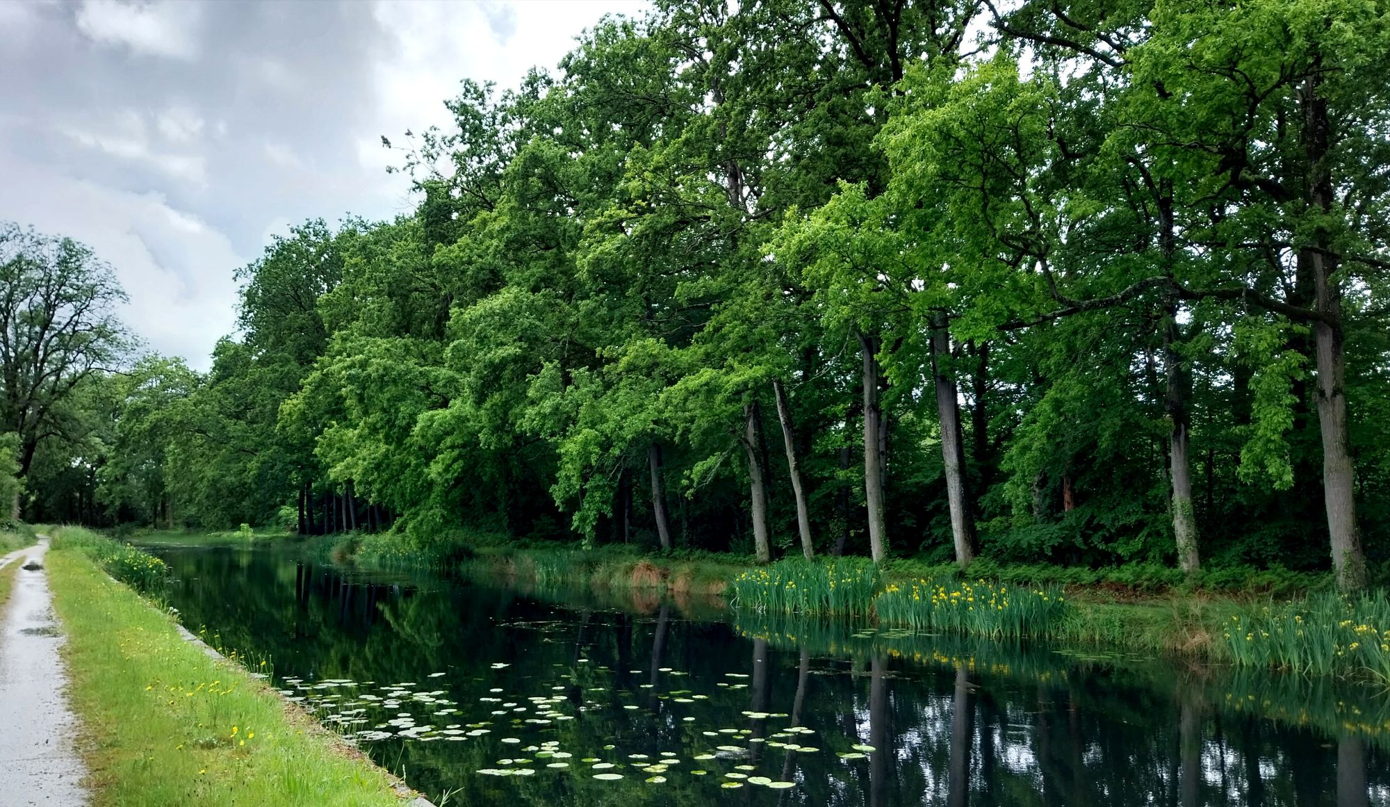 Juste le temps d’enfiler ma veste imperméable et la bruine commence à se faire sentir, pour se transformer quelques minutes plus tard en une énorme averse orageuse ! En quelques instants nous sommes trempées de la tête aux pieds, l’eau ruisselant de partout jusqu’à notre arrivée sur le canal de Nantes à Brest, qui longe le lac de Guerlédan.