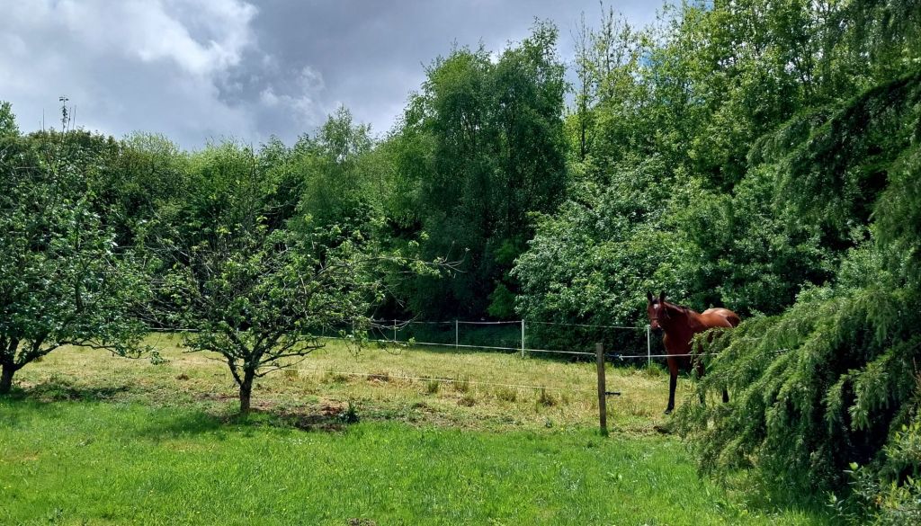 En début d’après-midi, nous arrivons à notre étape chez Paulette, au nord de Loudéac. Pendant que je mange un morceau et fait un peu de rangement, la jument se détend dans son pré du jour. Il est des lieux où elle paraît être instantanément comme chez elle, et se repose plus sereinement.