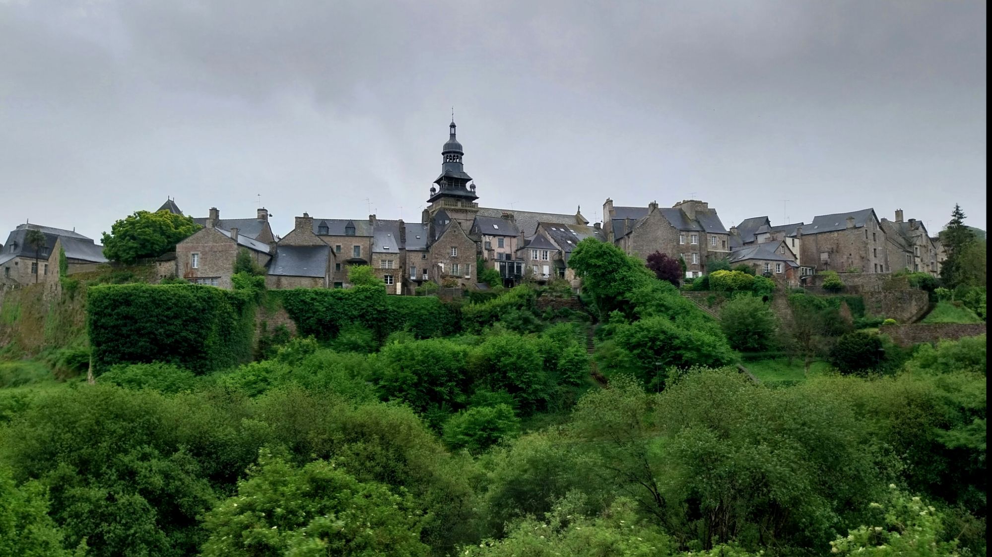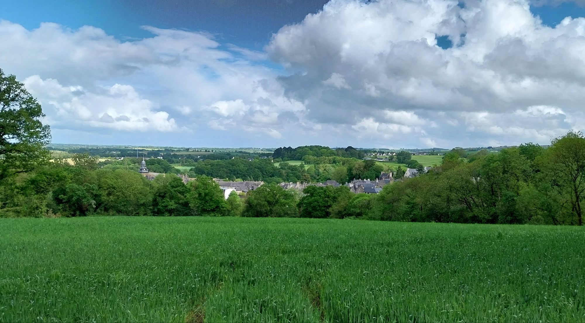 Cela permet de tester la nouvelle ferrure de la jument en étant allégées sur les 18kms qui nous mènent au très beau village fortifié de Moncontour. Une chouette étape, durant laquelle nous passons presque à travers les gouttes pour arriver au joli camping communal géré par Bruno et sa fille, ravis d’accueillir notre équipe originale.