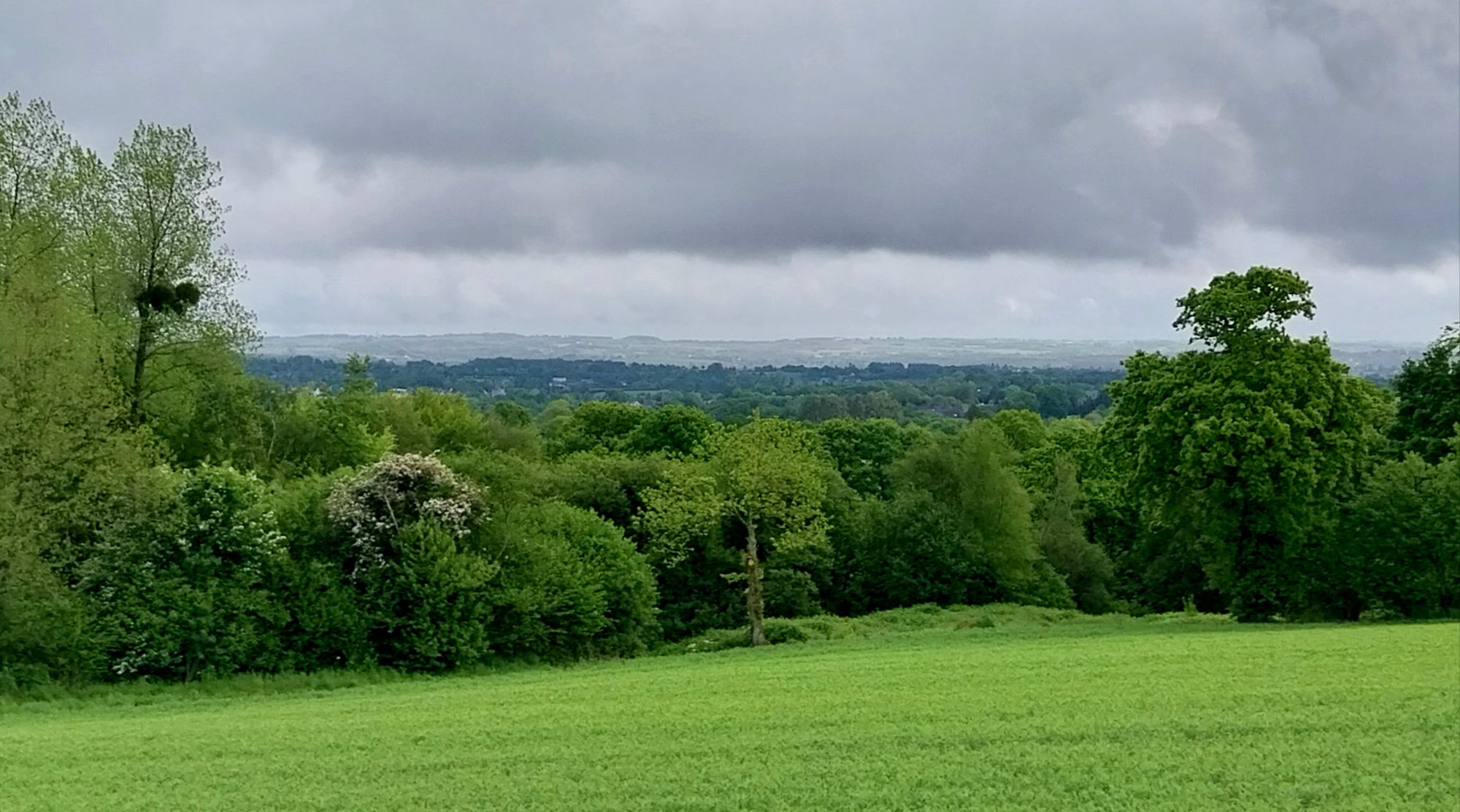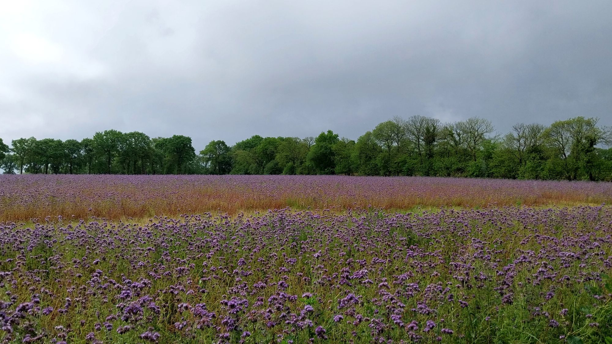 Nous rattrapons une voie verte à l’approche du lac de Guerlédan. Jusque-là on pourrait presque qualifier la journée « d’ensoleillée ». Mais c’est sans compter le gros rideau gris que l’on distingue plus loin en contrebas. Il nous reste cinq kilomètres à parcourir, et malheureusement c’est dans cette direction que nous nous dirigeons !