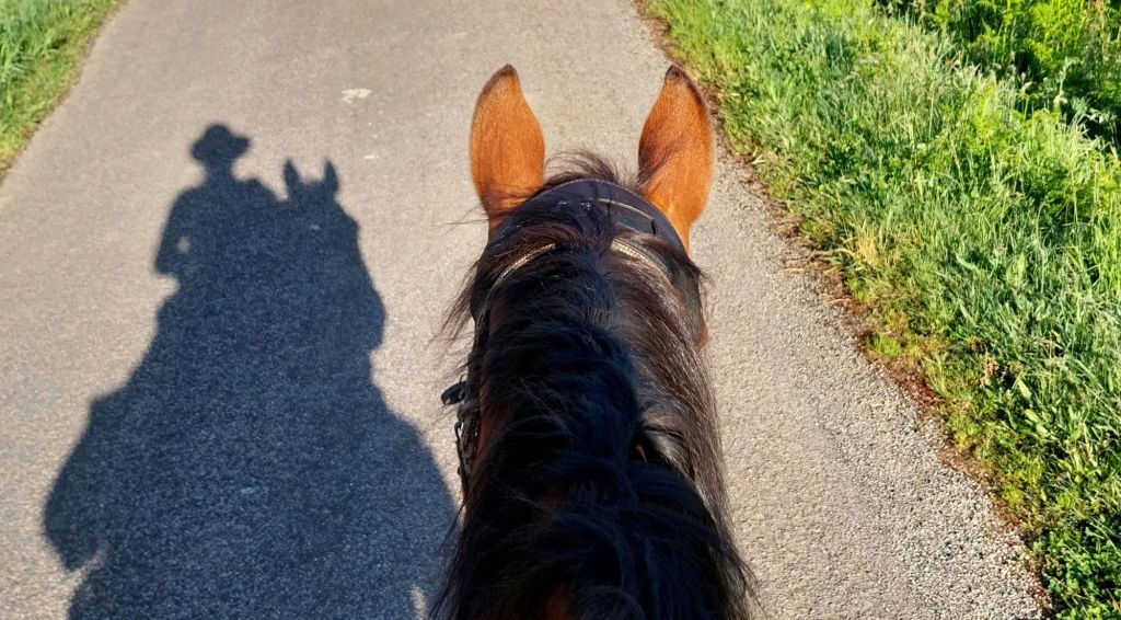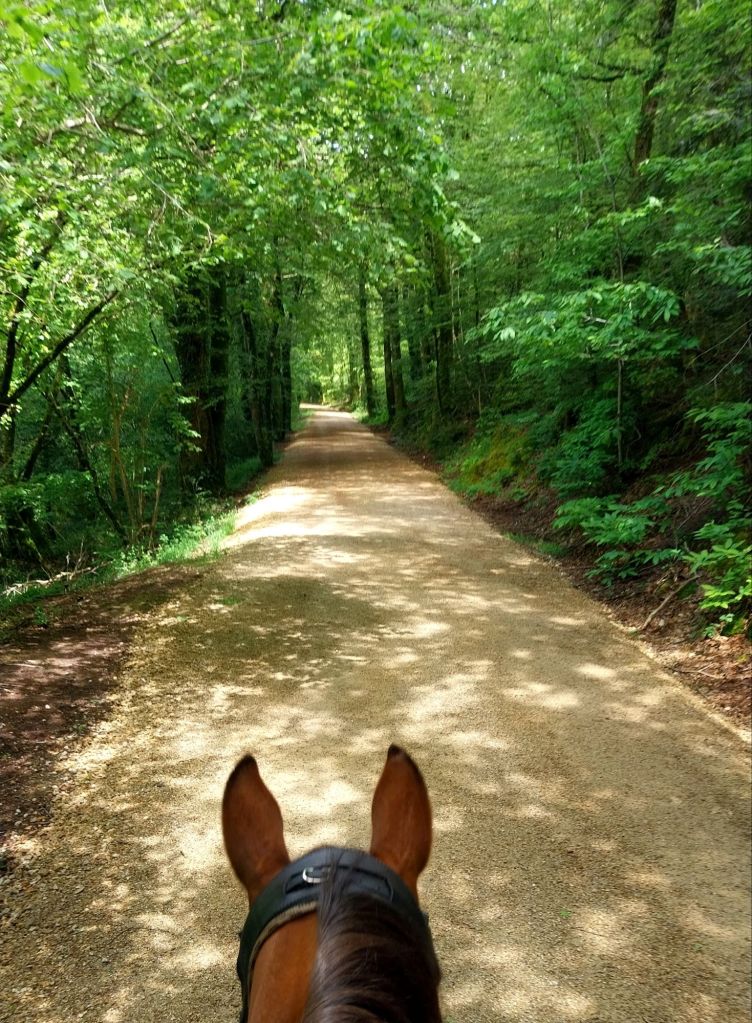 La lumière perce à travers les arbres, et mis à part quelques contournements de branches qui nous obligent à passer en dehors du sentier dans les sous-bois profonds et accidentés qui stressent toujours la jument, nous retrouvons rapidement une petite route aux bas-côtés en herbes fauchées pour prolonger sereinement notre avancée.
