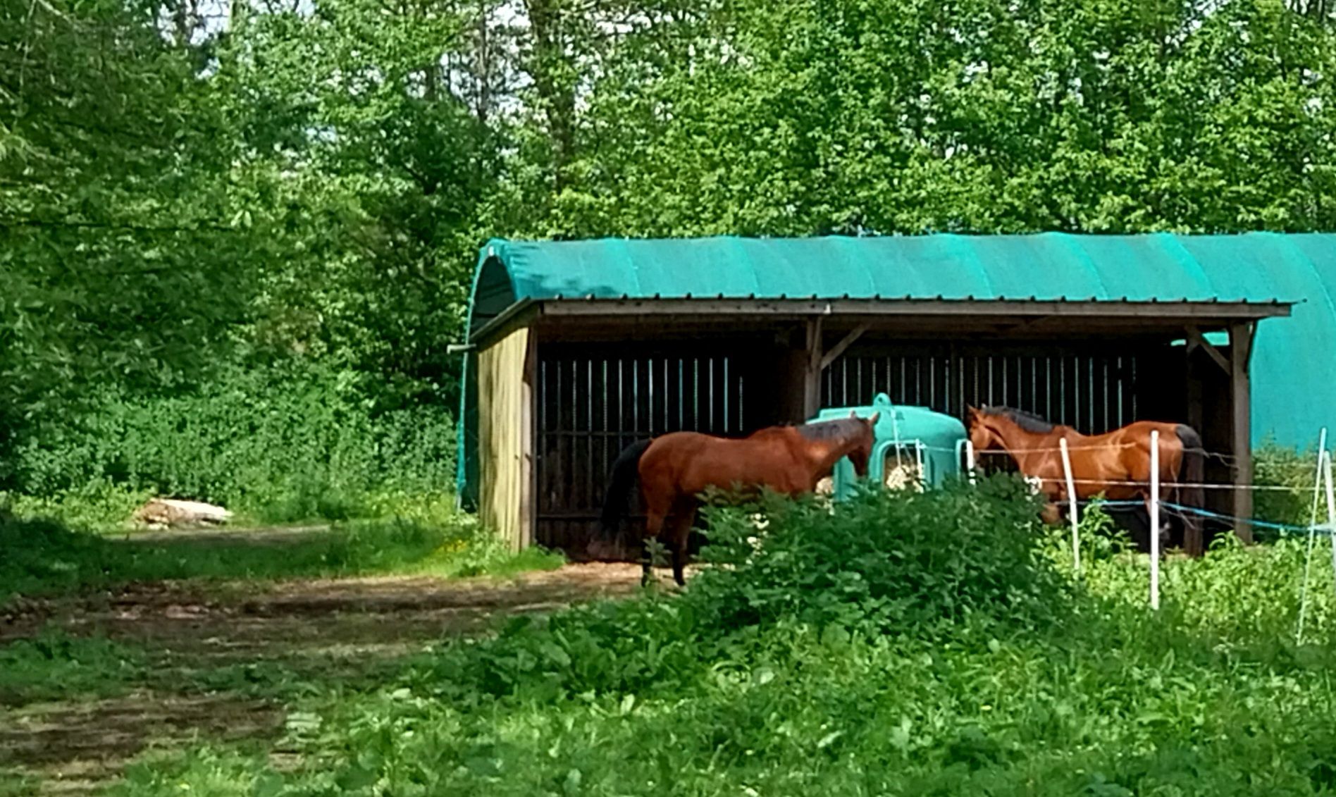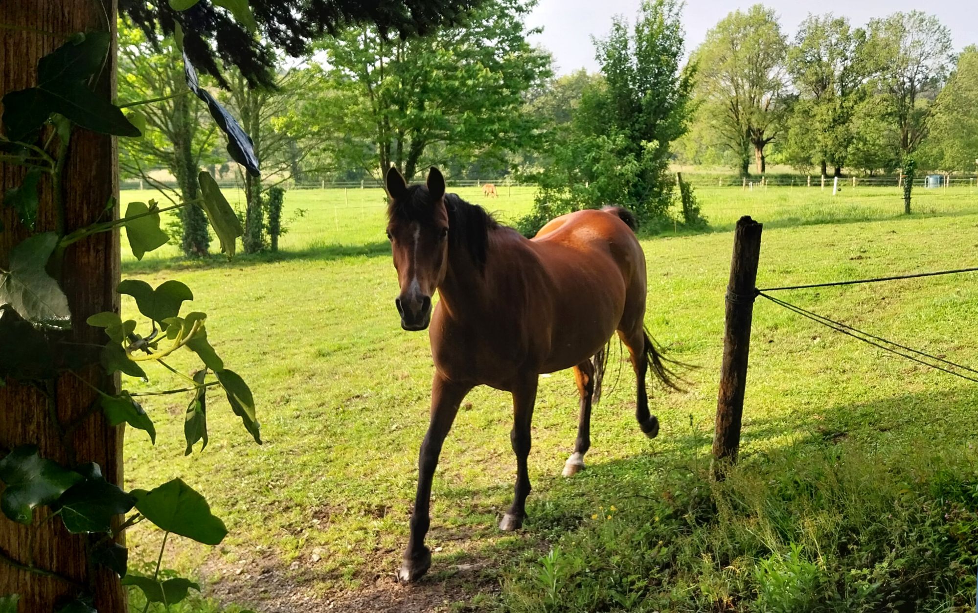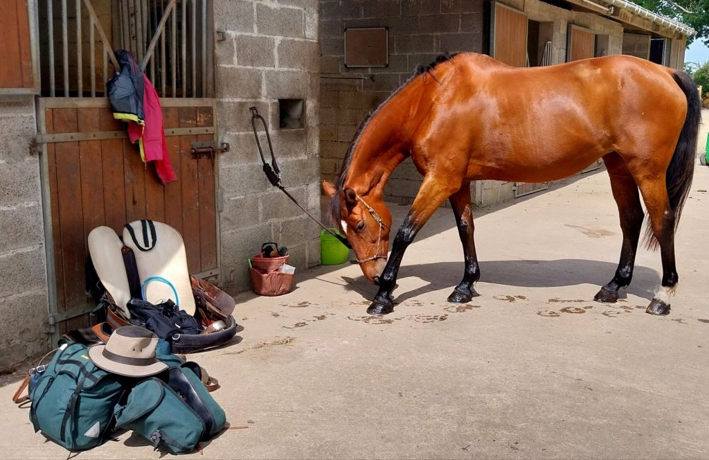 Arrivée aux écuries en fin de matinée, je nous déleste de notre chargement pendant que la jument récupère tranquillement au soleil. Une bonne douche sur ses tendons et elle retrouve ses copains de pré comme si de rien n’était !