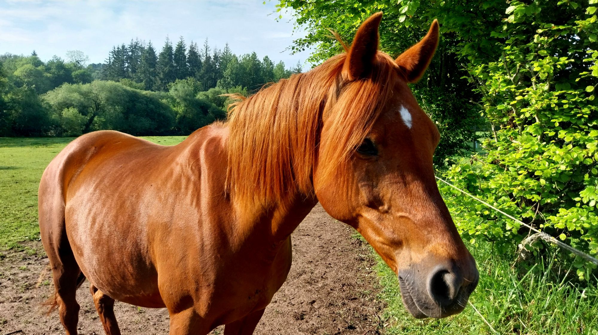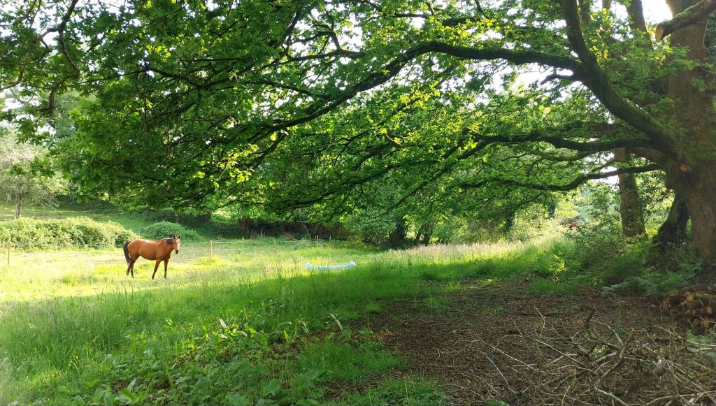 Sur place, elle retrouve deux autres chevaux de chaque côté de son pré, dans lequel un chêne aux larges branches protectrices lui permet de s’abriter de la pluie.