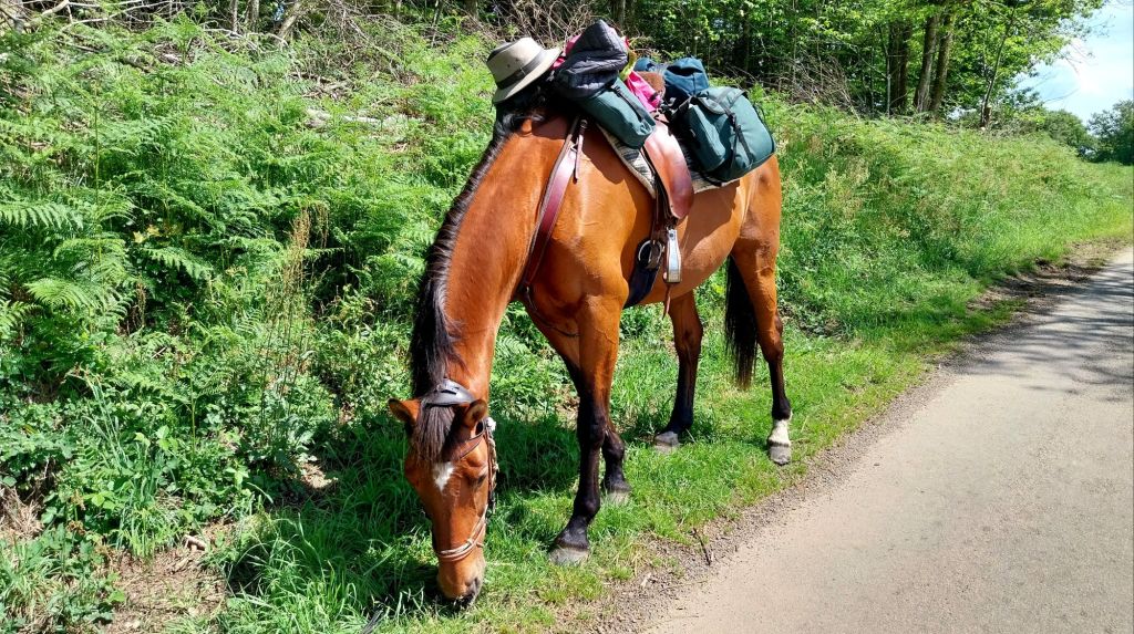 Dernière étape. Dernier check météo, qui va décider une fois de plus pour moi mes horaires de randonnée de la journée. Sans grande surprise, la pluie est à nouveau attendue à mi journée. C’est donc au petit matin que je quitte mon chariot d’américaine pour un ultime bouclage de mes sacoches. La jument m’attend sagement sous son chêne, je n’ai plus besoin de l’attacher pour la préparer.