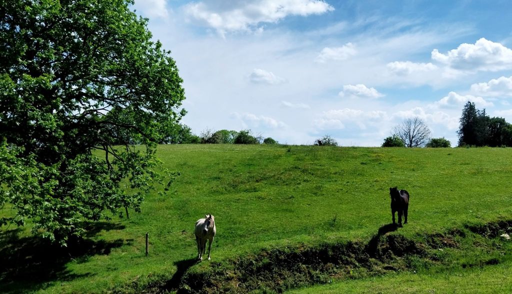 Une fois tout ce petit monde récupéré par les parents, Laurélie et Erwan – qui gèrent le club et habitent un peu plus loin – me laisse seule gardienne des lieux. Soirée au calme dans un grand gîte rénové, ma jument au pré devant mes yeux qui se repose dans les derniers rayons de la journée.