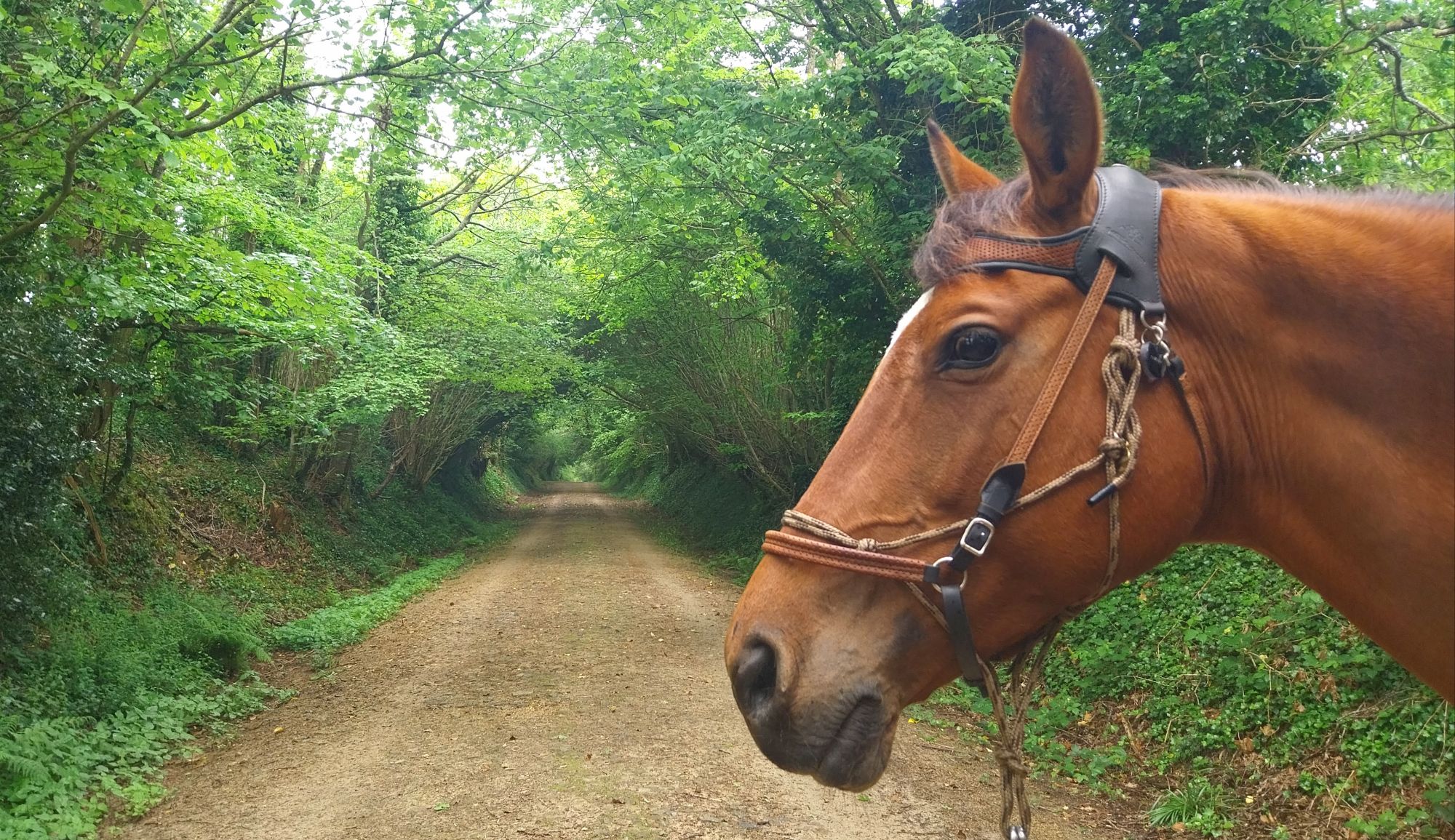 Arrivée a l’entrée de la forêt de Coat Loc’h, la jument reconnaît le chemin menant chez Virginie, et traverse les sentiers sans hésitation en accélérant le pas, oreilles pointées vers l’avant.
