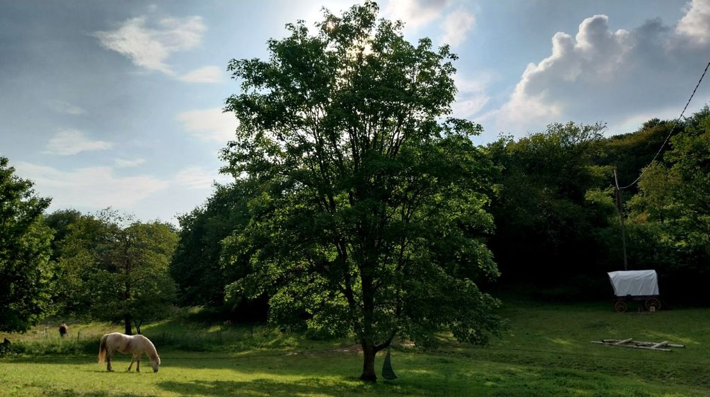 A peine installées que l’orage du jour se met à tomber. Ça gronde et ça tonne dans la forêt alentour. Trois heures plus tard l’ambiance paisible de fond de vallée est revenue, et je peux prendre mes quartiers dans le chariot western que Virginie m’a réservé pour l’occasion !
